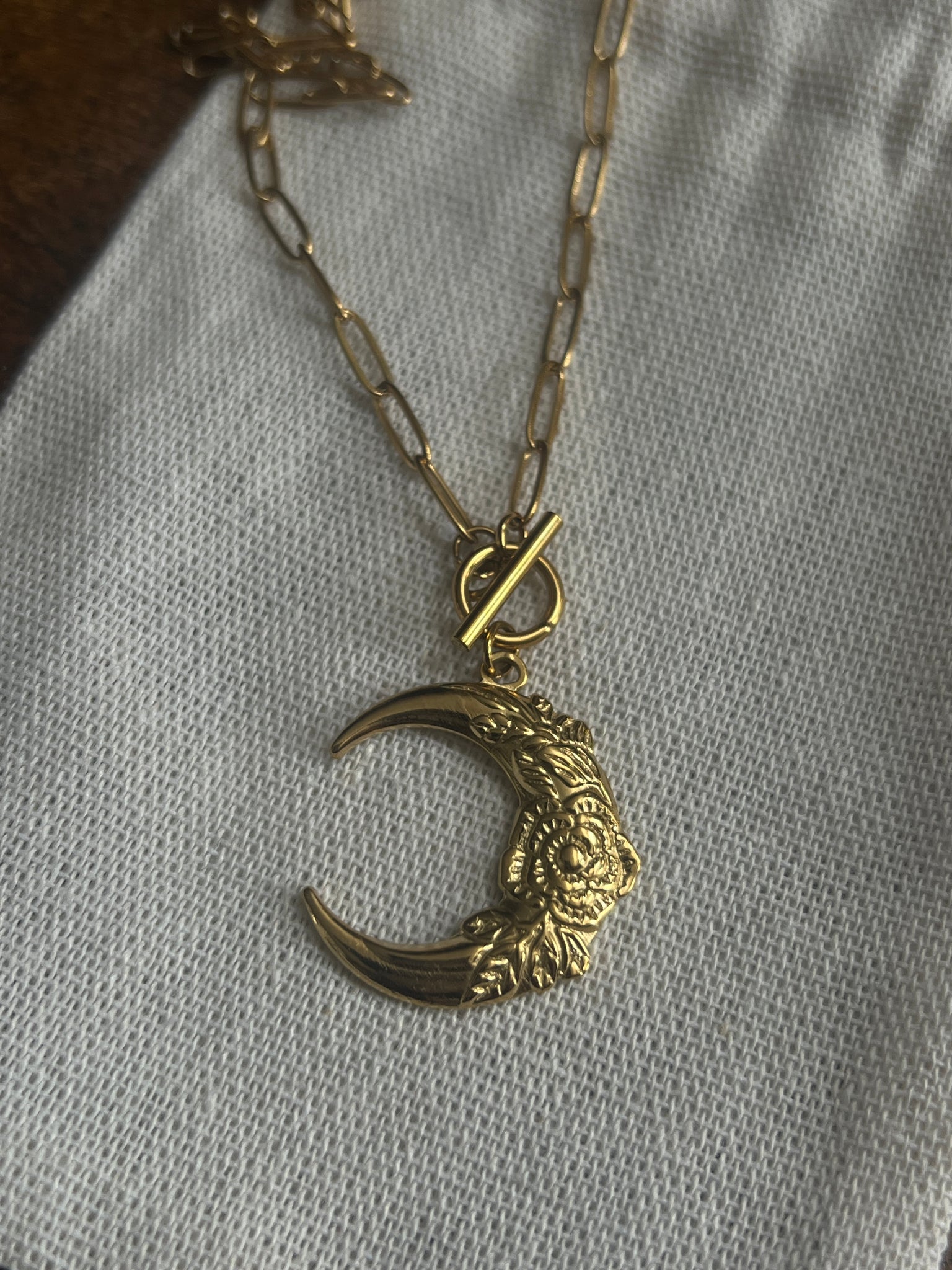 This listing is for one Moon with engraved flowers. Chunky paper clip chain. Opens and closes with front toggle.Gold plated stainless steel chain approximately 19inch.