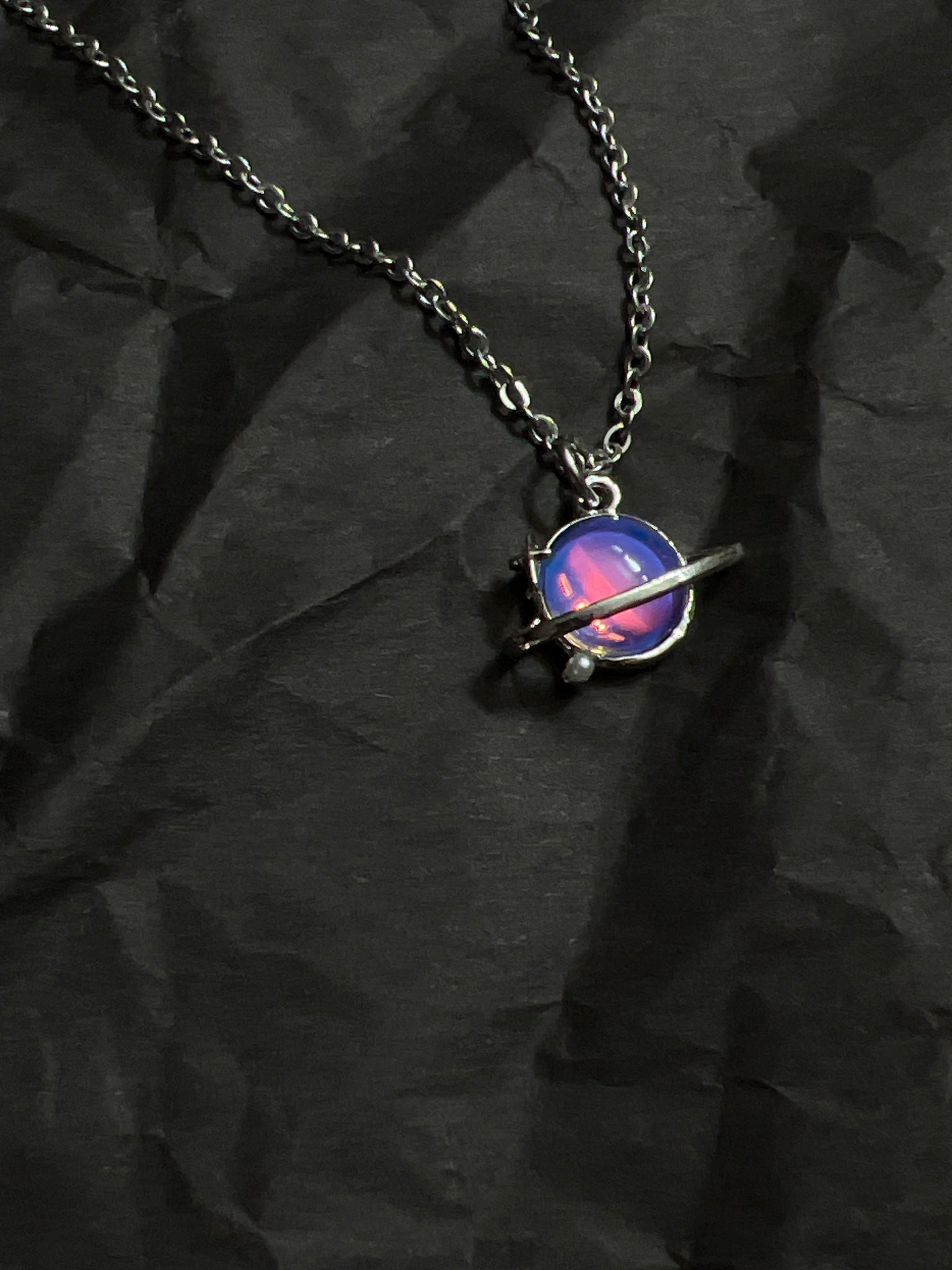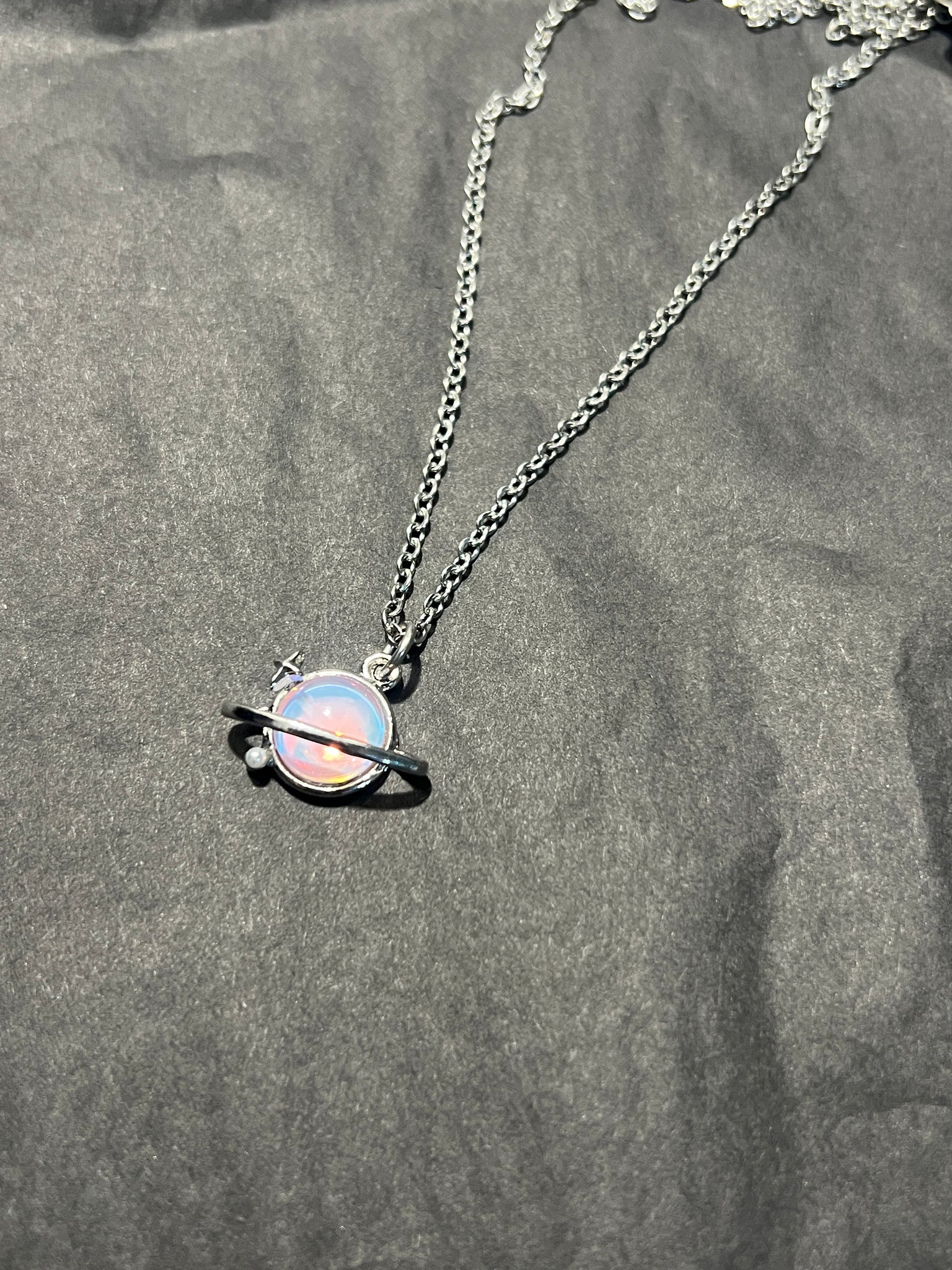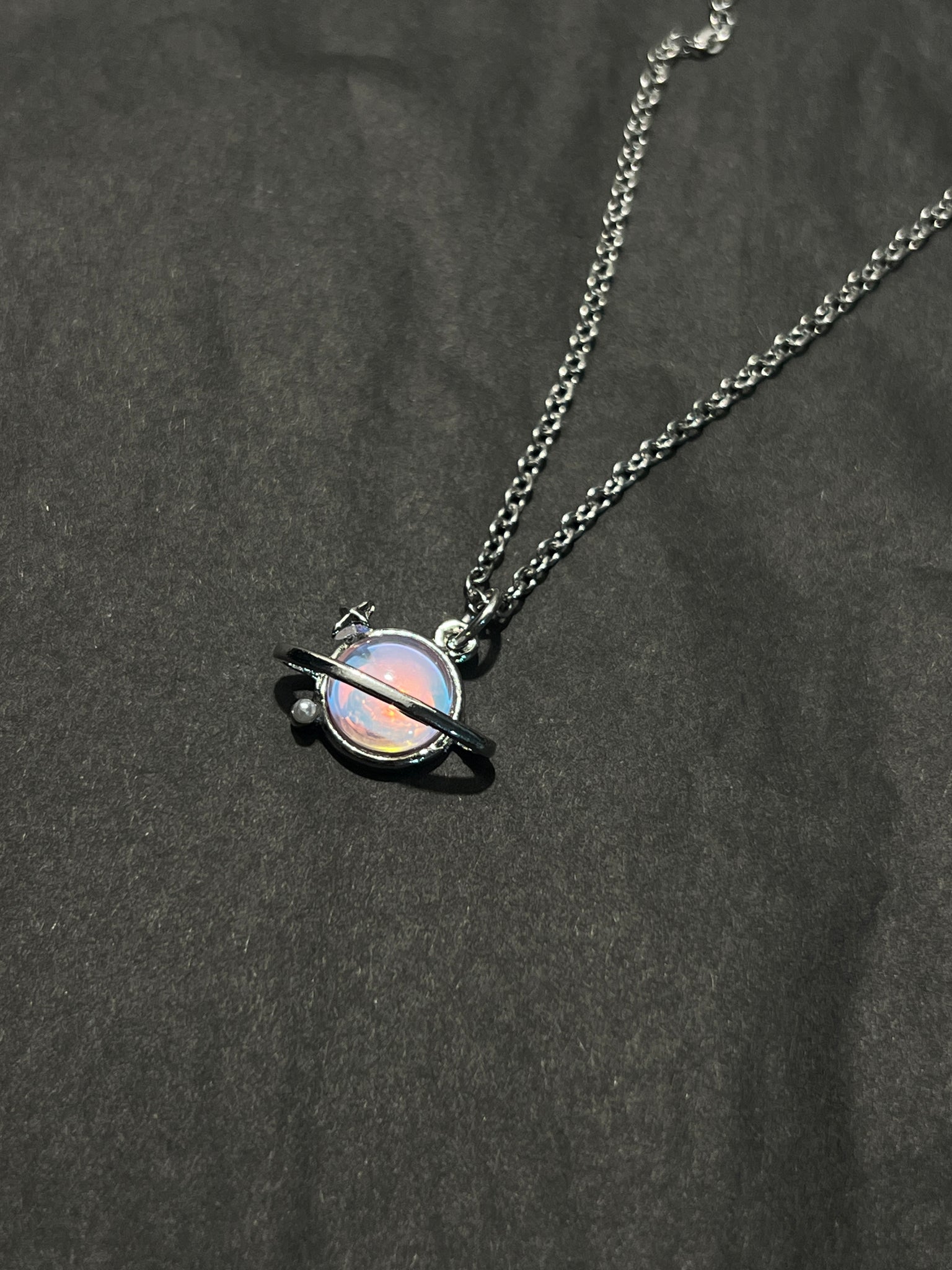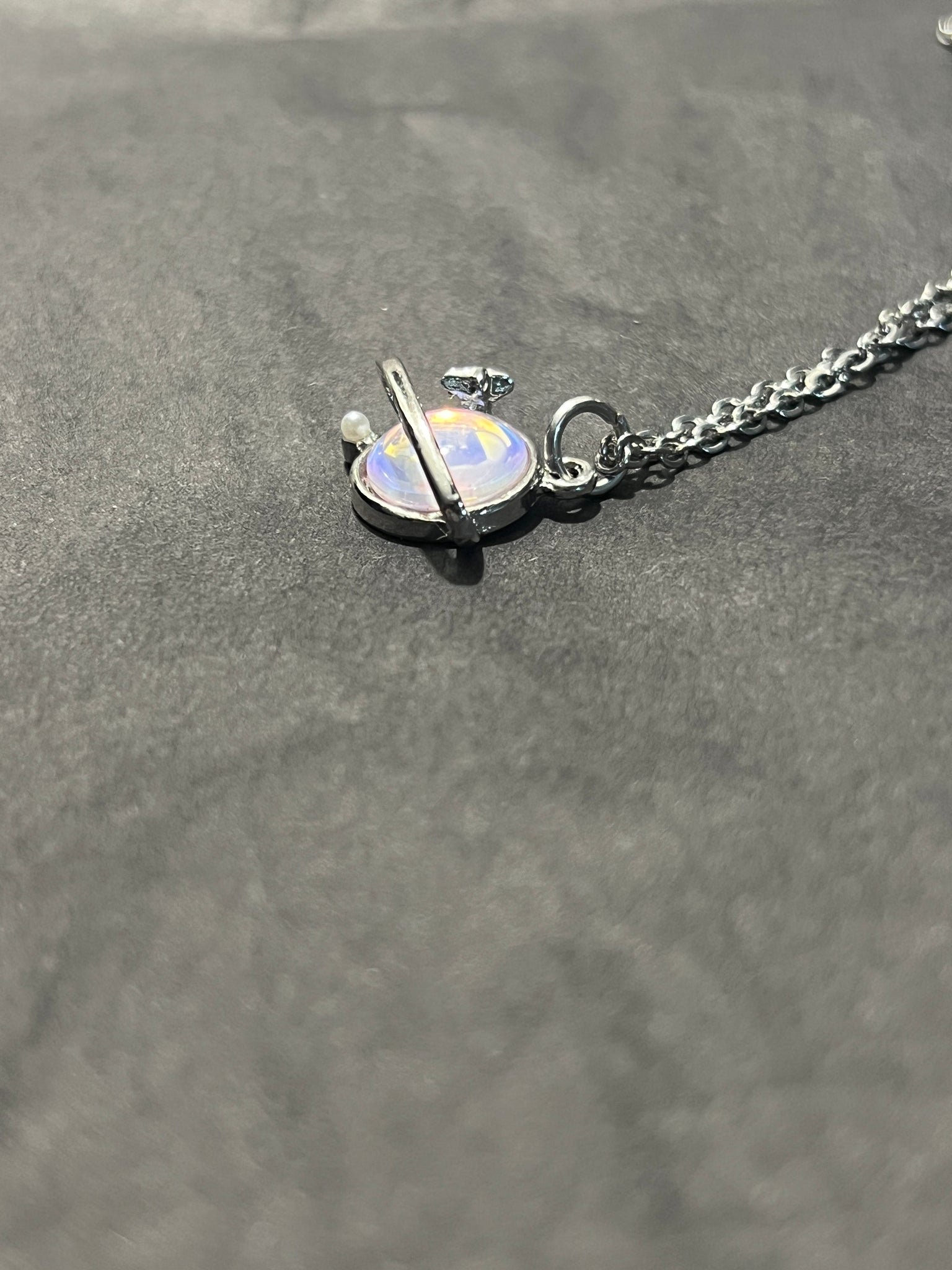 Silver plated planet with small faux pearl and Opalite. Hangs on stainless chain approximately 20 inch.