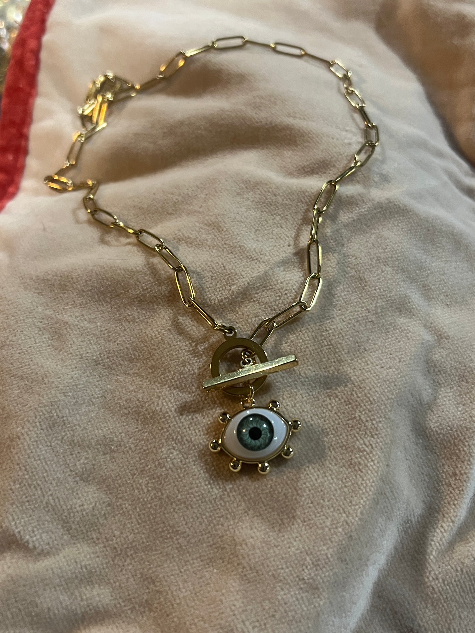 This thing is for one evil eye necklace.paper clip chain is gold coated stainless steel approximately 18 inch