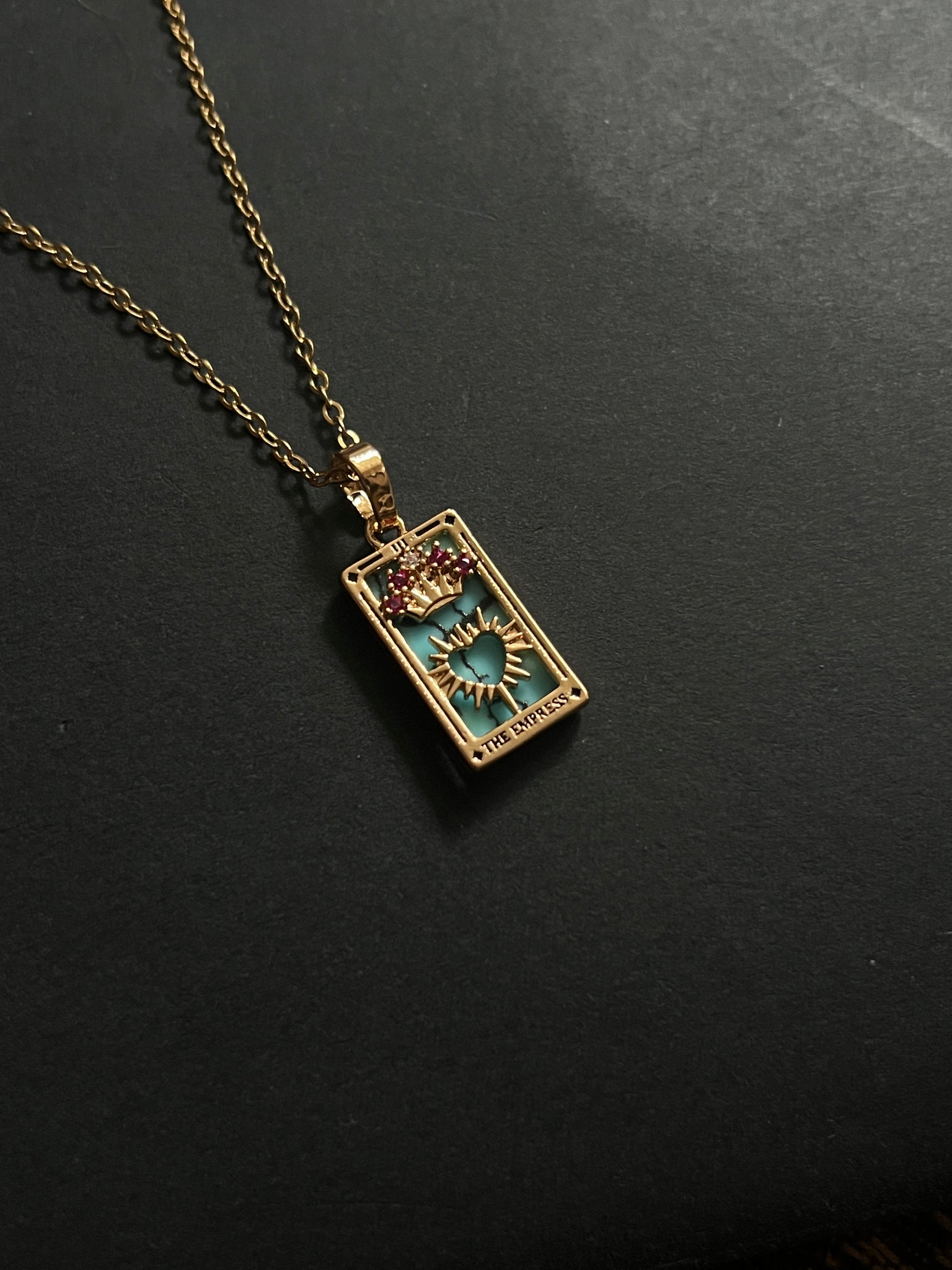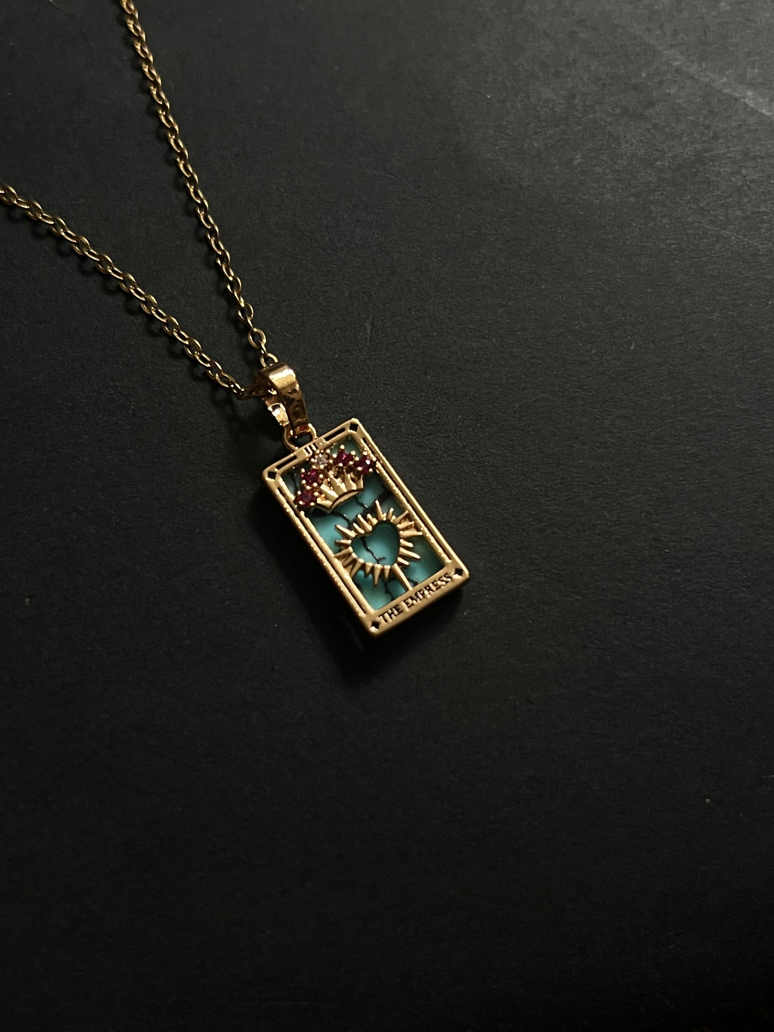This necklace is the Empress necklace. Turquoise coloured howlite sits in the back. Gold plated stainless steel chain measures approximately 16 inch with a 2 inch extender.